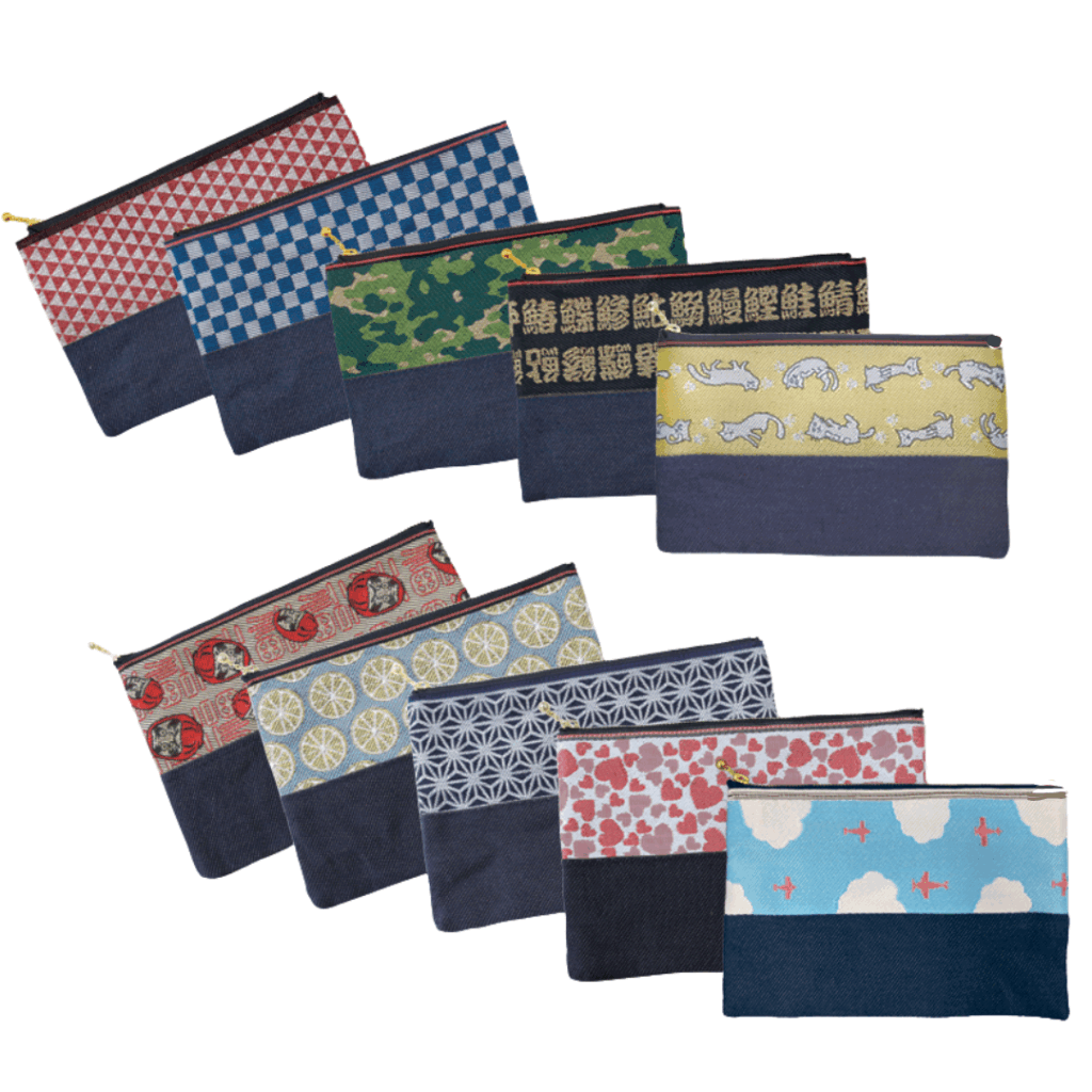 畳縁とは、畳の長辺に縫い付けられた織物のこと。軽くて丈夫な素材で、ミシン縫いでも手縫いでも縫いやすいのが特徴です。デニム生地と畳縁を組み合わせて自分だけのオリジナルポーチが作れます。ファスナーがすでに取り付けられているため簡単に作ることができます。日本製の織物・畳縁ですので伝統文化も学べます。