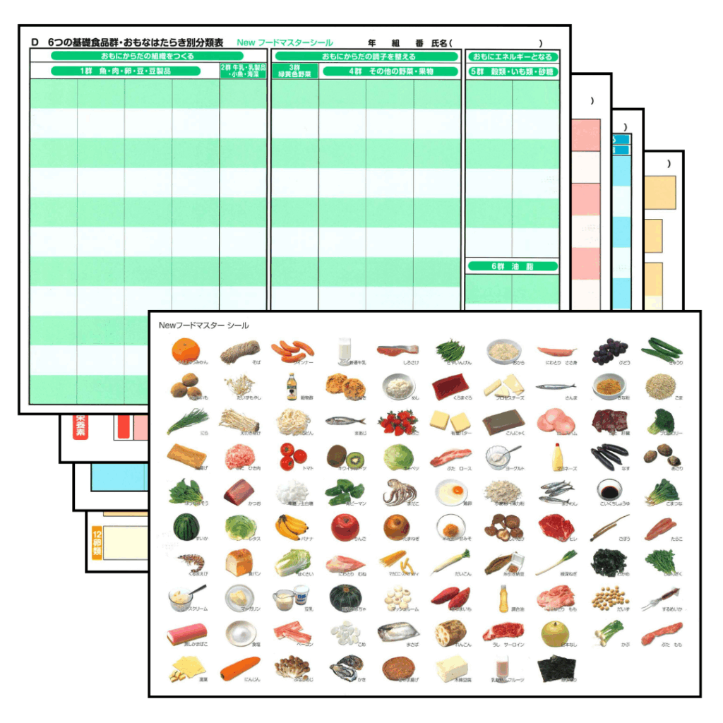 台紙は栄養素、4つの食品群、6つの基礎食品群、食品成分表で使われる18食品群の4種類あり、シールを貼ったり、はがしたりしながら机の上で食品と栄養の学習ができます。学習のまとめができるワークシート付き。