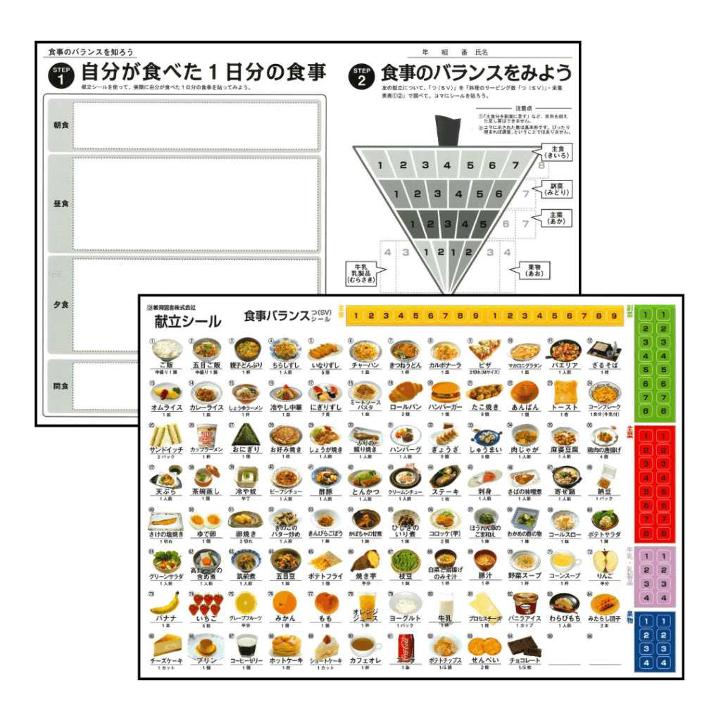 1日の献立を立て作成し、そのバランスを食事バランスガイドや栄養計算によって自分で考えた献立の栄養バランスを確認することができ、何度も貼りなおすことによって、バランスの良い献立を立てることができます。