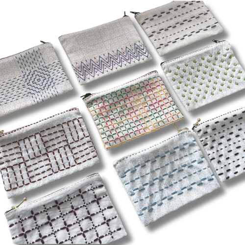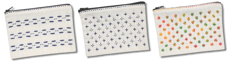 ポーチの製作は、手縫い糸(細口)を使用し、普通の手縫い針を使用した方が縫いやすいですが、刺し子糸と刺し子針を使用して製作することも可能です。刺し子糸を使用する場合、カラフルでポップな仕上がりが可能です。