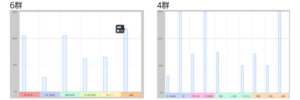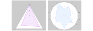 作成した献立の栄養価はレーダーチャート、バーチャートで表示されます。食事区分 (1 日、朝、昼、夕、間 )ごとに比較することが可能です。PFC バランスも、視覚的なチャートで表示。