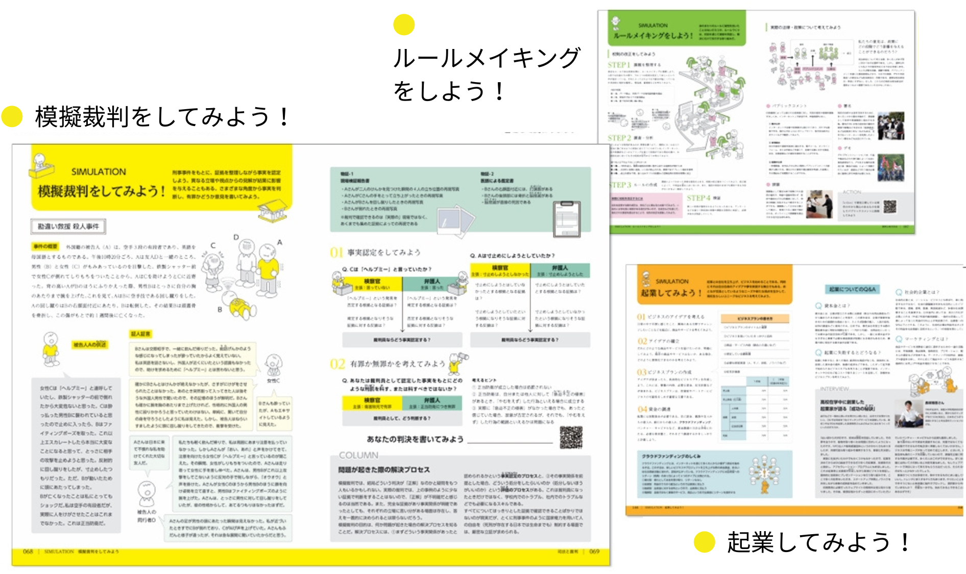 教科書改訂にあたり、私たちは知識編の質を高めるために用語を拡充し、最新の研究結果や教科書採用校からの意見を取り入れ、選定テーマも見直しました。同時に、公共の目指す社会参加を一歩実践へと促したいという思いから、新たに3つのシミュレーションコーナーを設けました。