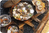 あさりやはまぐりをねぎと一緒にみそ仕立てで煮込み,どんぶり飯にかけた料理である。江戸時代に浦安海岸や隅田川河口で採れた貝類を使ったものが源である。