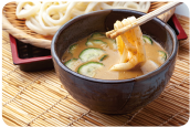 すったごまにみそとだしを加え,シソの葉,きゅうりの輪切り等を加えて冷し,うどんをつけて食べる。