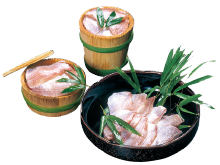 とらふぐをつかった刺身,ちり,雑炊などがあり,「福」にあやかって「ふく」と呼ぶならわしがある。刺身は,大皿の模様が見えるほど薄切りにして盛り付けるのが特徴。