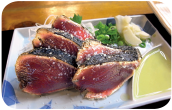 かつおを皮のついたまま5枚おろしにし,金串にさして表面をあぶり,冷水で冷やして食べる。稲わらであぶると香りがつく。にんにく,しょうが,ミョウガなどを添える。