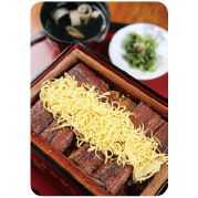 タレをかけた飯に,かば焼きのうなぎと錦糸卵を載せて蒸籠蒸しにしたもの。福岡の柳川発祥。