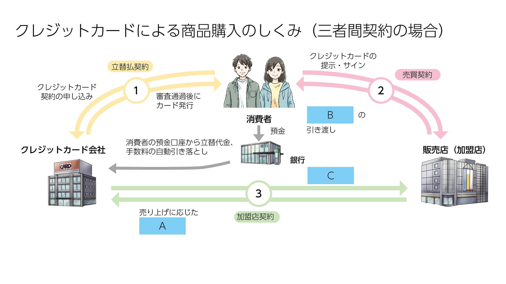クレジットカードを使った売買は、消費者、販売店、クレジットカード会社の三者がかかわり、「三者間契約」と呼ばれる。クレジットカード会社は、消費者が必ず返済をするという信用をもとに商品の代金を立て替え、クレジットカードに加盟している販売店から、売り上げに応じた手数料を得ている。