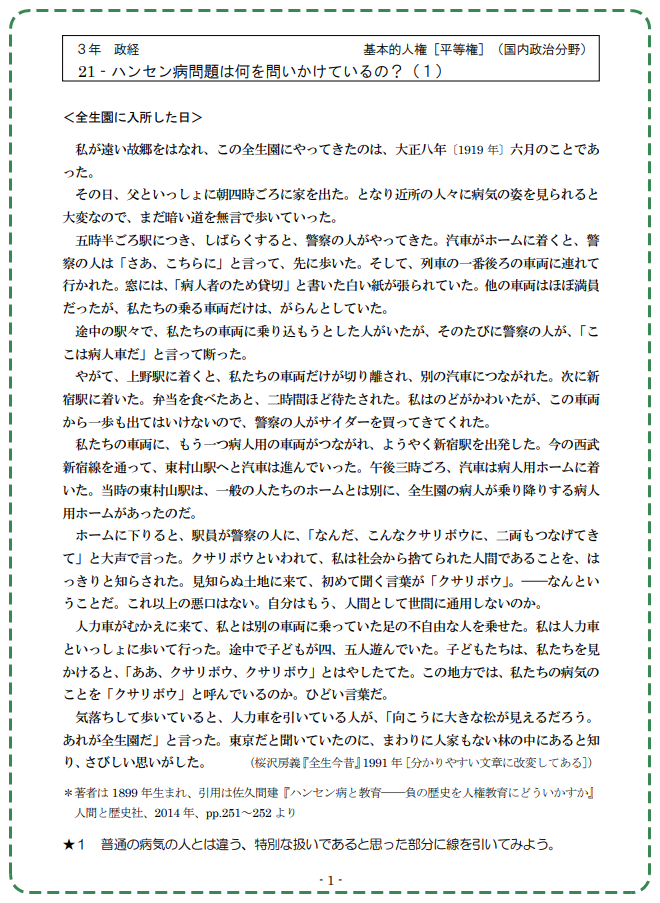 私は、複数の学校で公民科の科目を担当してきましたが、どの科目を担当してもハンセン病問題を取り上げています。基本的な素材や手法は科目によって変わりませんが、「現代社会」「政治・経済」では「憲法・人権」に寄せて、「倫理」では「人間の命と尊厳」に寄せて展開しています。