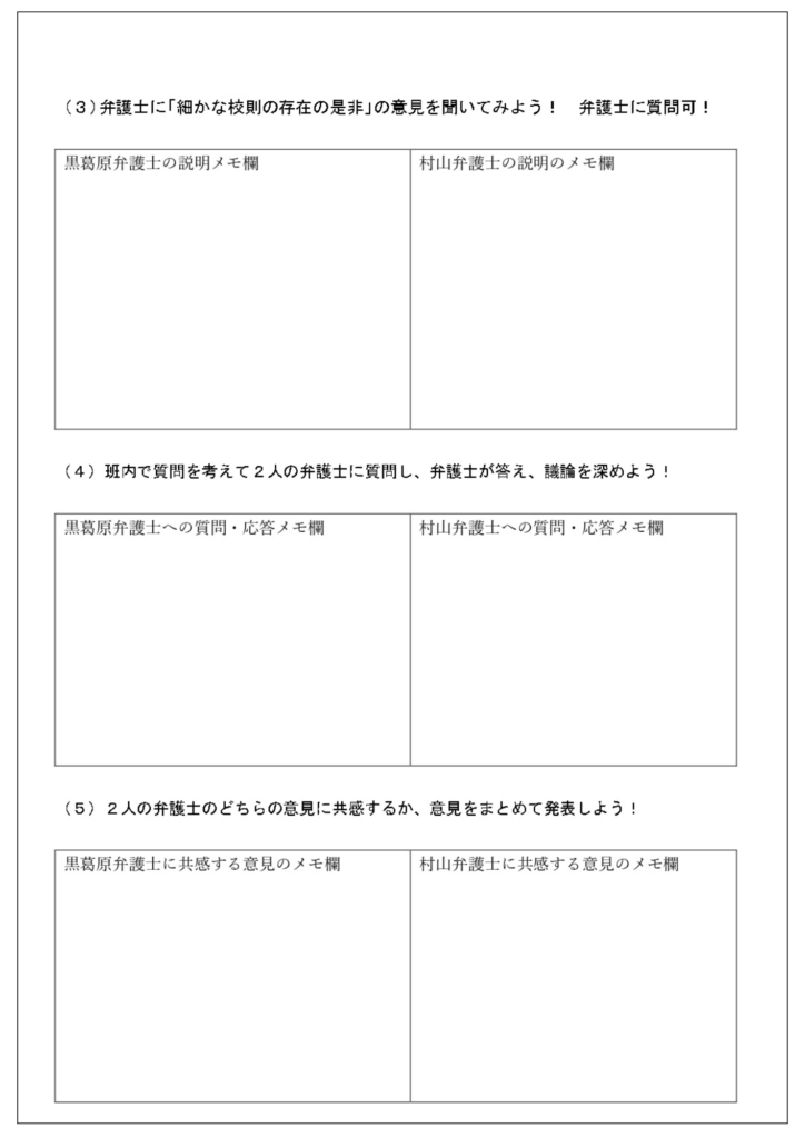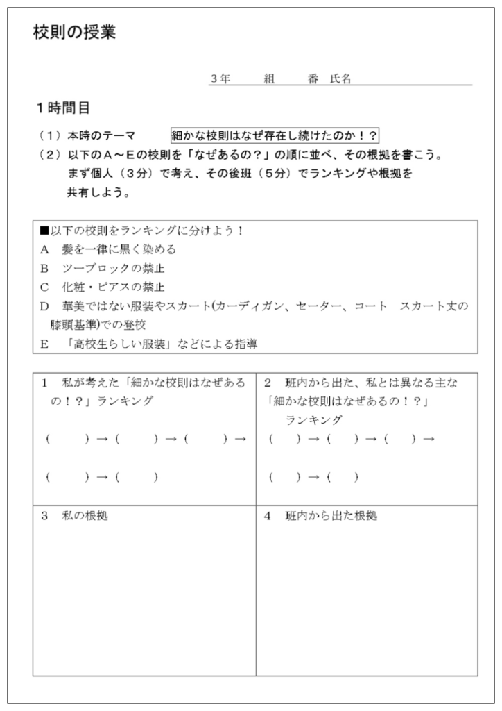 1時間目の授業は、過去から現在まで長く存在し続けた、いわゆる「あってはならない校則」について、「問題がある順」に、ランキングをつけさせ、二人の弁護士から「細かな校則の存在の是非」について意見を聴きます。