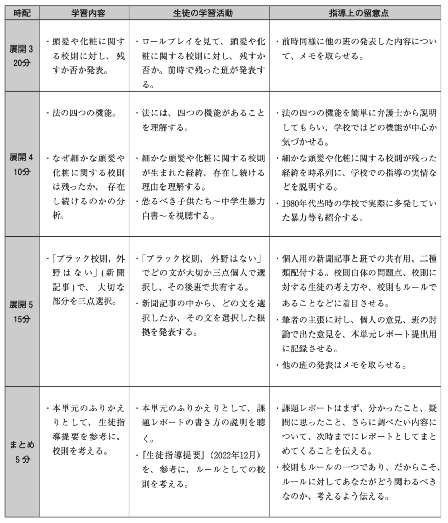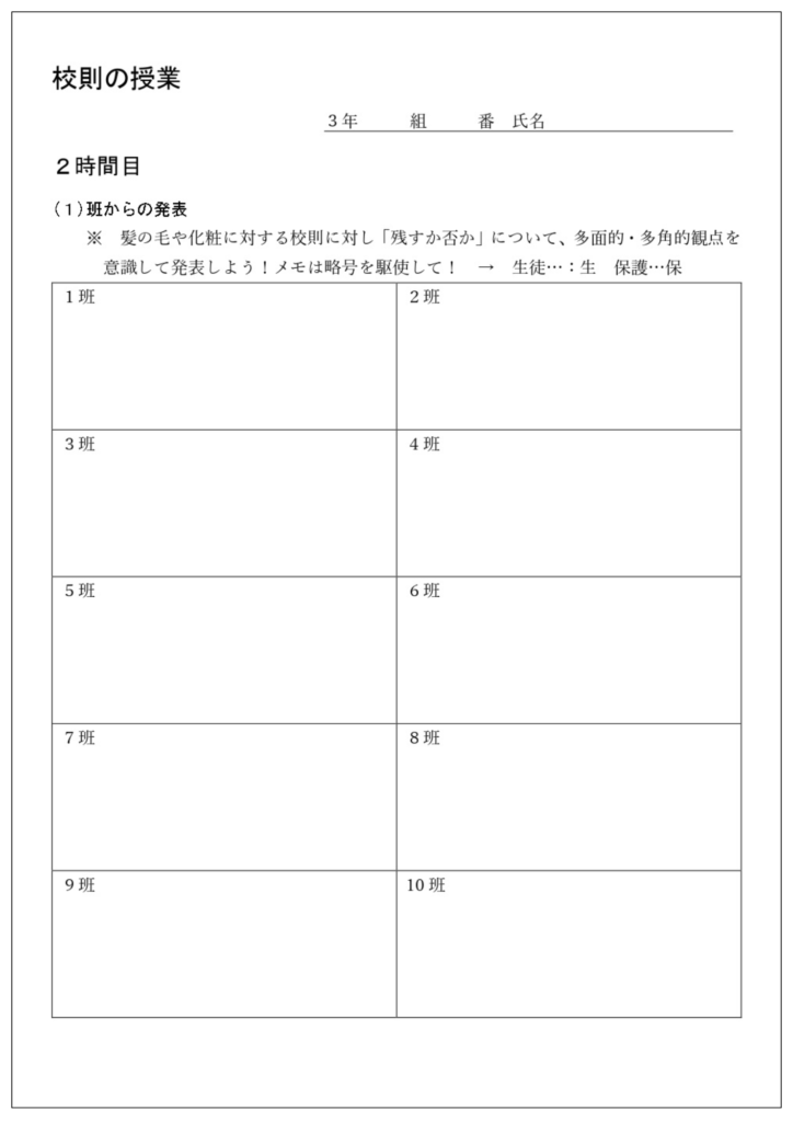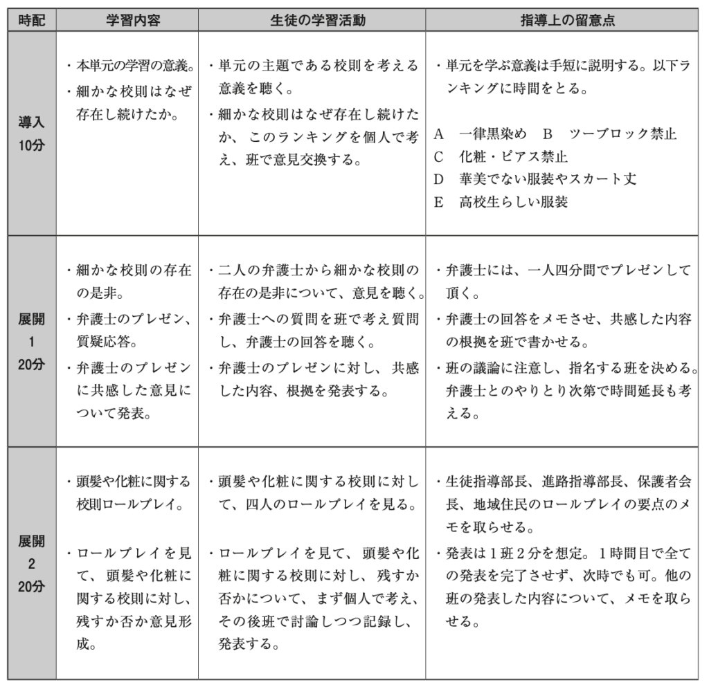 校則を変えることを目的に授業設計、実践したのではなく、「細かな校則はなぜ存在し続けたのか」を主題とし、特に頭髪、化粧に焦点をあて、法教育、シティズンシップ(市民性)教育の一環として、二時間単元で授業設計しました。そして、今回の授業実践では、ルールとしての校則のあり方や校則に内在する諸課題、校則と地域、学校内外の異年齢間における校則に対する考え方の相違点、今後の校則の在り方などについて、生徒と先生が考えるために、法教育、シティズンシップ教育を主目的としています。