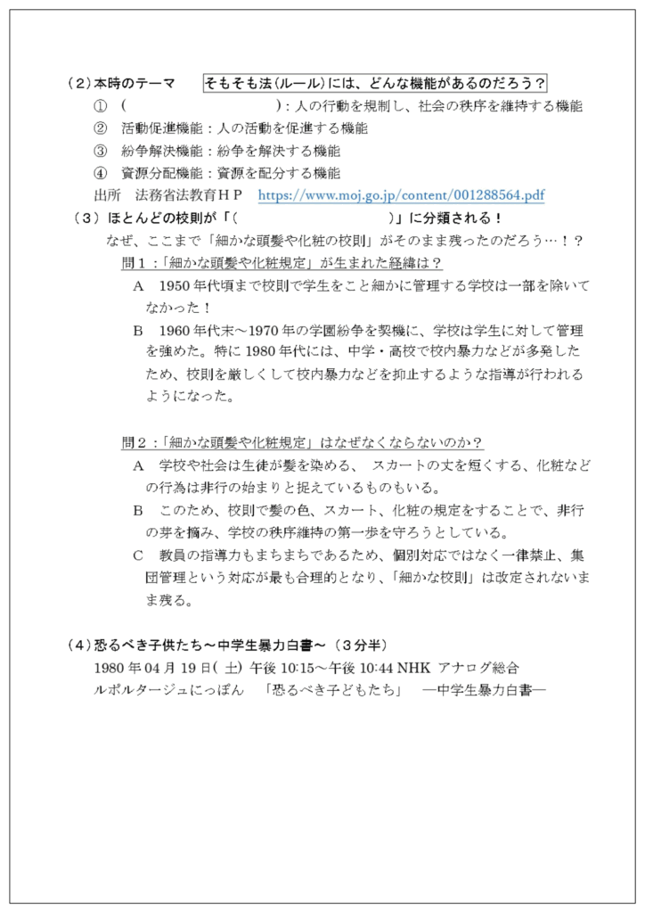 2時間目の授業は、そもそも法にどんな機能があるのかについて学びます。この機能をもとに、「細かな頭髪や化粧に関する校則」が残った経緯、そもそも校則はいつから導入されたのか、細かな頭髪や化粧に関する校則はなぜなくならないのかなどについて理解します。映像や資料を参考にし、最後に分かったこと、疑問に思ったこと、さらに調べたい内容について課題とし、提出させます。