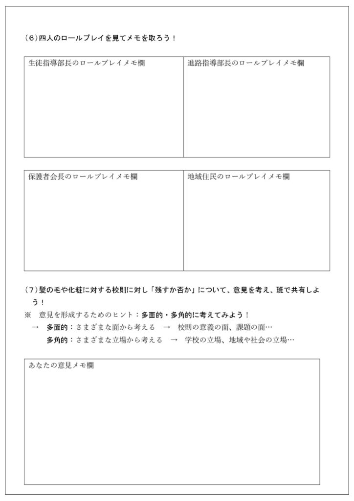 例えば、校則の意義、学校の立場、地域や社会の立場といった多面的多角的に考えさせることで、「所属を表す」「一体感を得る」「社会慣習に沿って礼儀を示す」「個性を表現する」といった衣服や頭髪の社会生活上の働きに気づかせた上で、校則を考え直させるような授業構成になっています。これは、公民科のみならず家庭科の視点が反映されています。