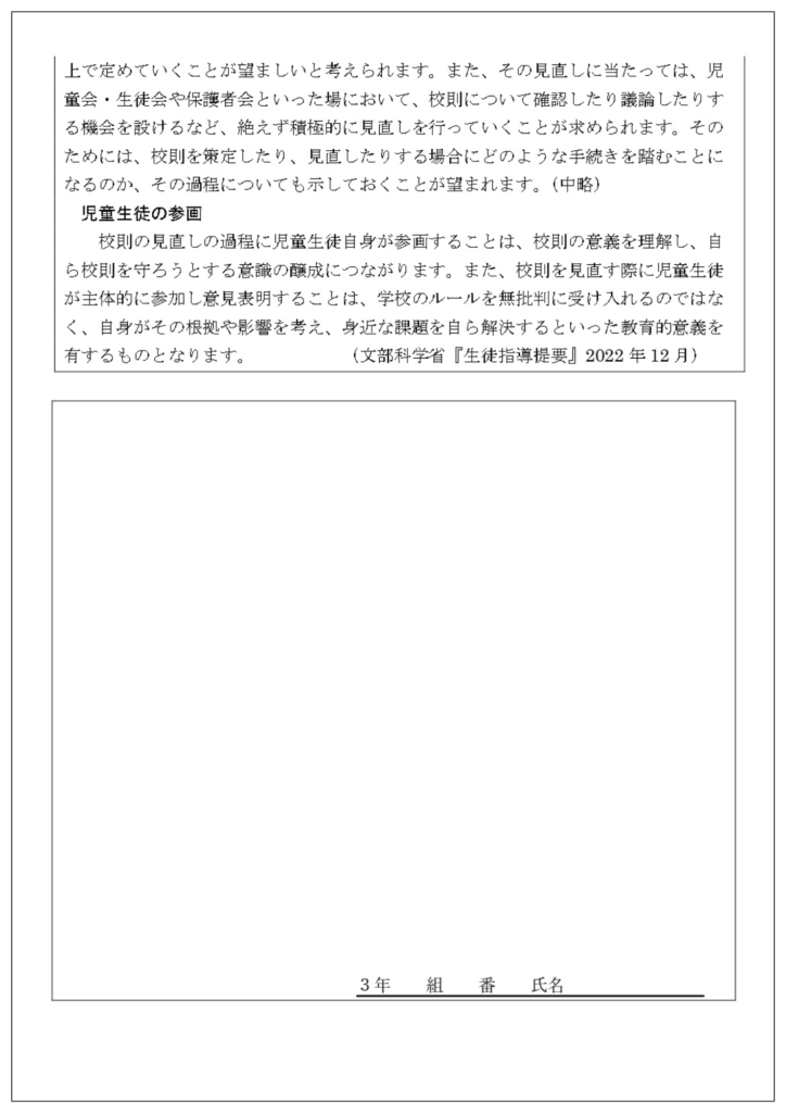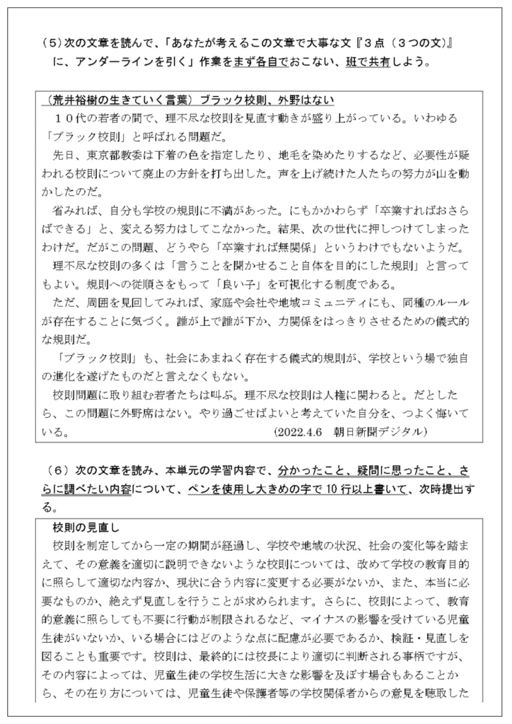 この授業は、校則を「ルール」として捉え、その内容、意義、課題などを生徒が理性的に分析できるように設計、生徒に多角的な視点から物事を分析する力と、自分なりの意見を形成する力を身につけさせることを目指しています。