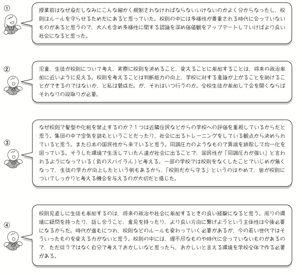 1人は「社会人として企業に勤めたら、就業規則に従う。この訓練として校則は存在する」立場。もう1人は「本来人間は自由であるべきである。または学校生活において、最低限のルールは必要であるにせよ、『最低限』でなくてはならない」とする立場です。