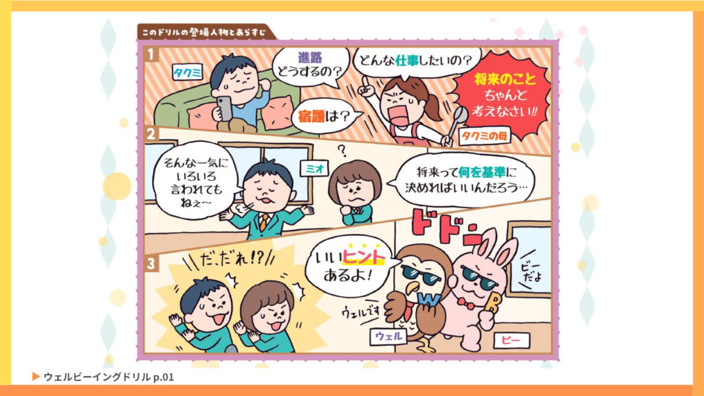 各章では、フクロウの「ウェル」さんとウサギの「ビー」さんが、「多面的(さまざまな要素で考える)」および、「持続的(長い一生を通して考える)」な視点で、ウェルビーイングを考えよう!と呼びかけています。