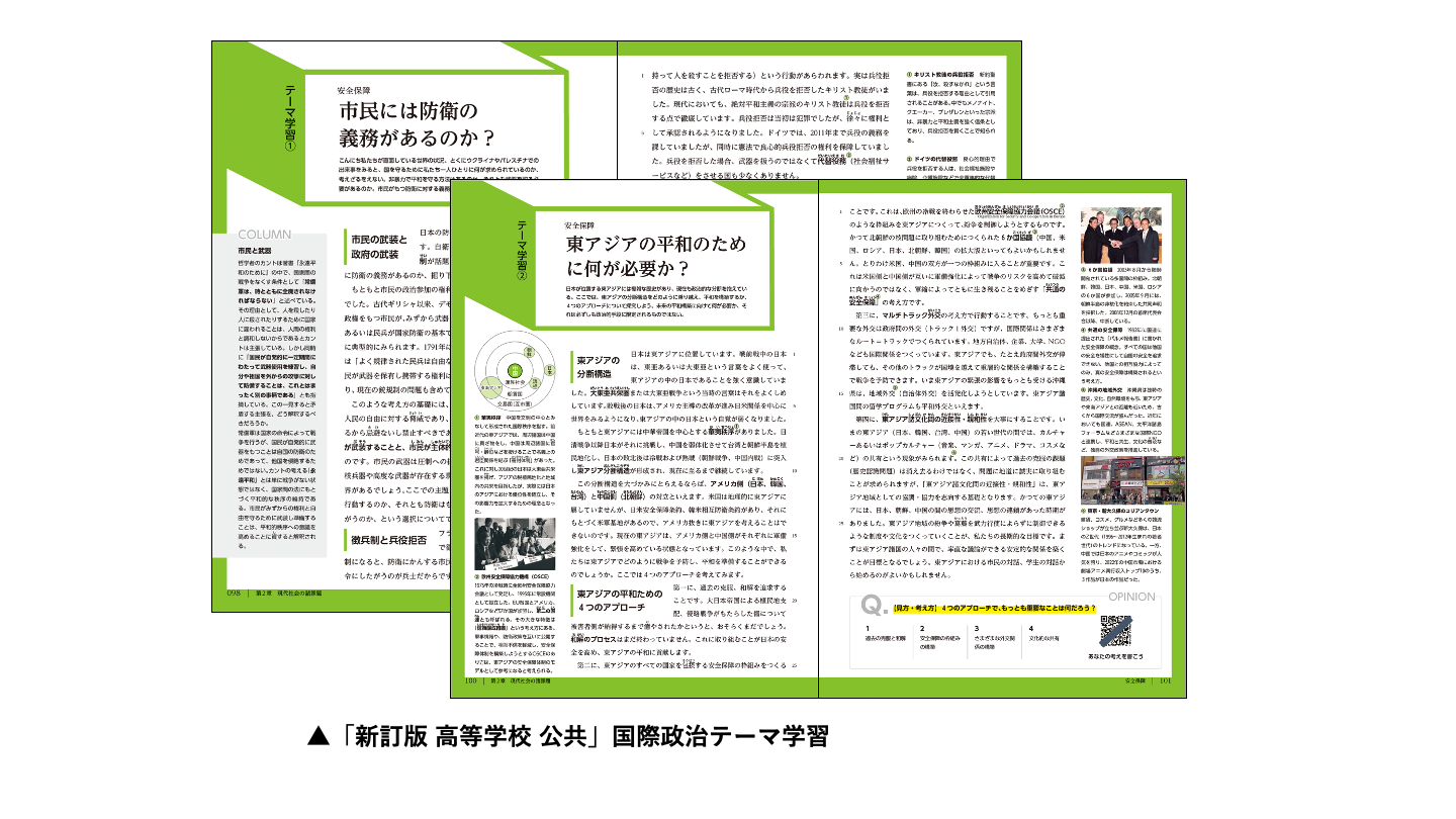 国際社会における南北格差構造(世界史 / 政経)、現代の戦争とそれらへの日本の関与(世界史 / 日本史)、東アジアにおける敵対関係・分断の起源・現状と克服の道筋(世界史 / 日本史 / 政経)、国連の意義、限界、再活性化の道筋(世界史 / 政経)、武力行使によらない紛争解決の方法をどう見つけるか(政経 / 倫理)など。