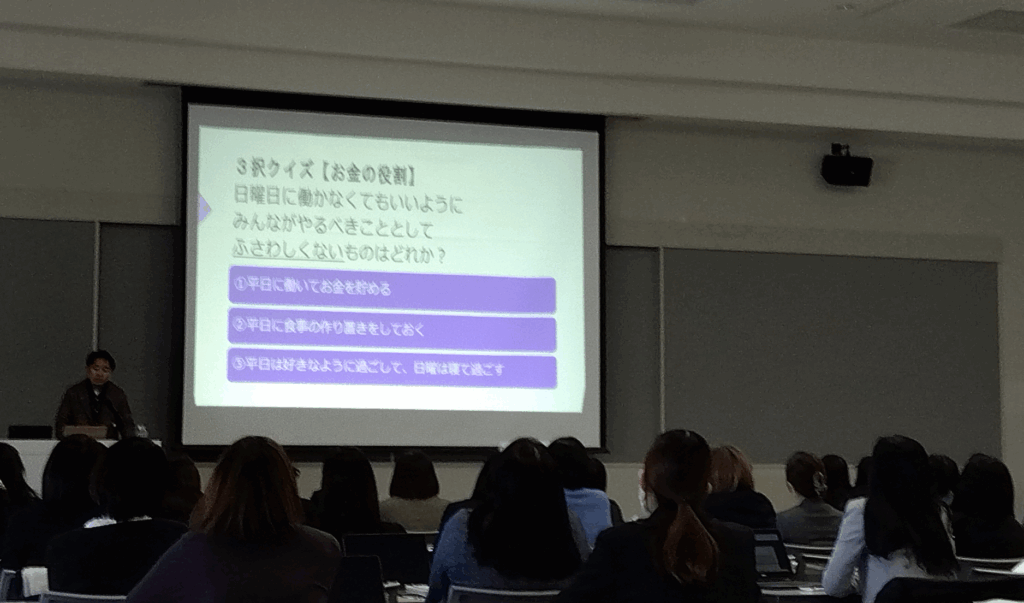 講演では、「いつも500円で売られている高級みかんジュースがある日、300円に値下がりしていて買って飲みました。ところが次の日200円に値下がりしていました。このとき得した?損した?」「日曜日に働かなくてもいいようにみんながやるべきこととして相応しくないものはどれか?』などのクイズ形式を交えて、身近な例から日本の物価高や人口減少といった社会問題に繋げていき、「お金の役割」「お金と社会の関わり」を分かりやすく解説していました。特に印象的だったのは、「金融」の定義に関するお話です。