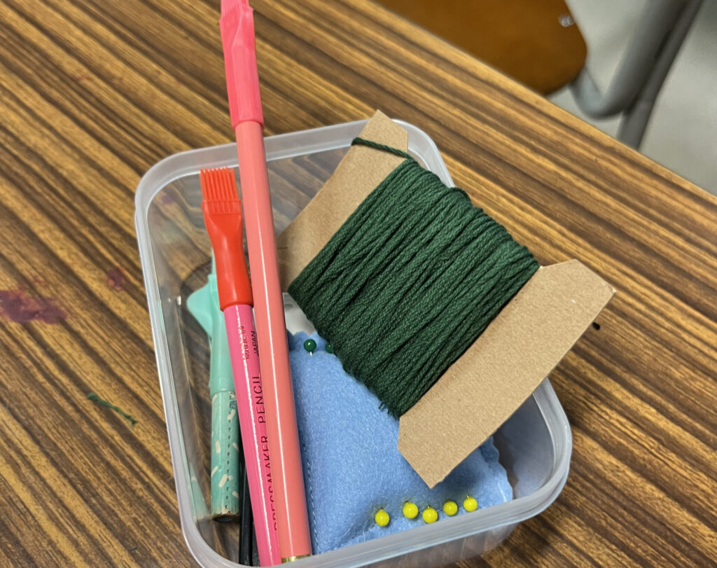 ▲裁縫道具は、小さなプラスチックのボックスの中に、糸切りばさみ、チャコペン、糸通し、ピンクッション(まち針、縫い針)、手縫い用糸(ファスナー付け、脇縫い用)を学校で用意。
