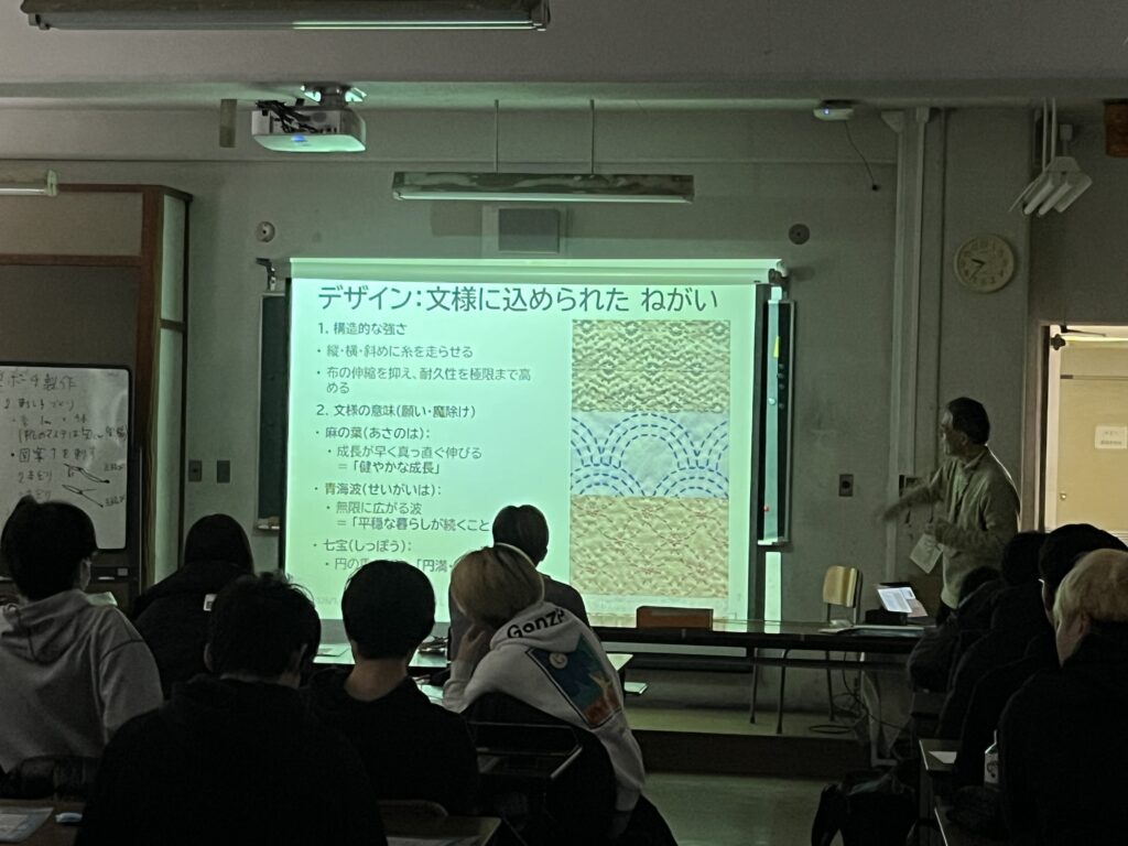 ▲初回の授業の導入の様子。植村先生は実習前に「刺し子とはなにか」「何のために製作するのか」など、授業スライドをつくって解説を補足し、生徒たちに教材の糸を丁寧に伝えてくださいました。