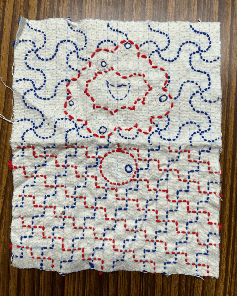 - 刺し子を一列縫うたびに、爪でしごいたこと。シワがよらないように気をつけた。