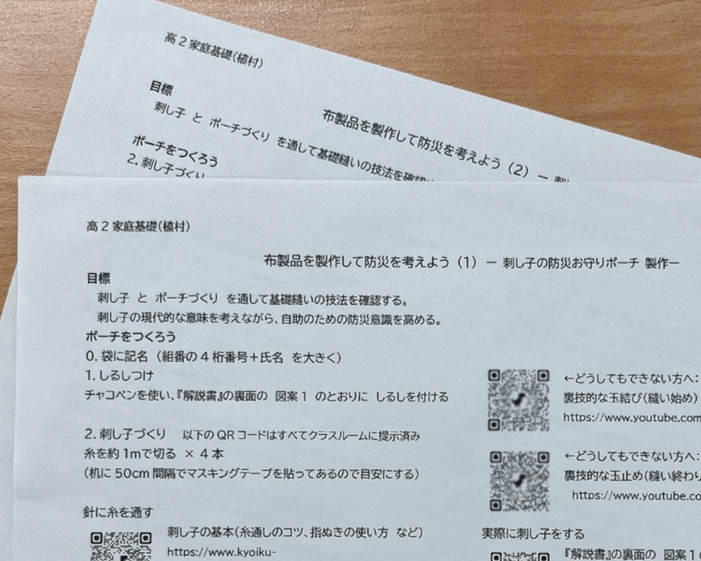 「刺し子の防災おまもりポーチ」は、企画段階で先生方に試作・アンケートを行うなど、これまでになく丁寧なプロセスを経て教材化したつもりでした。しかし、実際に実習を見学してみると、「生徒が知りたいのはそこだったのか!」「解説書のあそこに、あれをもっと大きく書いておけばよかった!」などと、これまで気づかなかったことにたくさん気づかせていただきました。