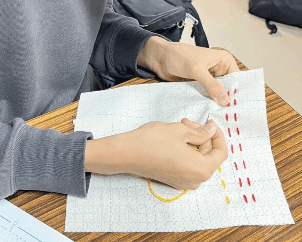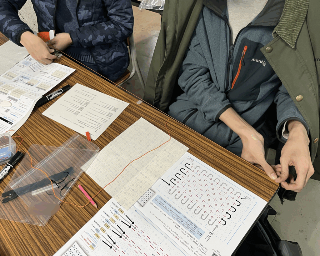 本校では数学に関心をもつ生徒が多く、「一目刺し」の規則性や幾何学的な特性は彼らに合いそうだという感触が試作段階で得られました。実際に取り組ませると、生徒たちは一針一針進める作業に予想以上に集中して取り組んでいました。