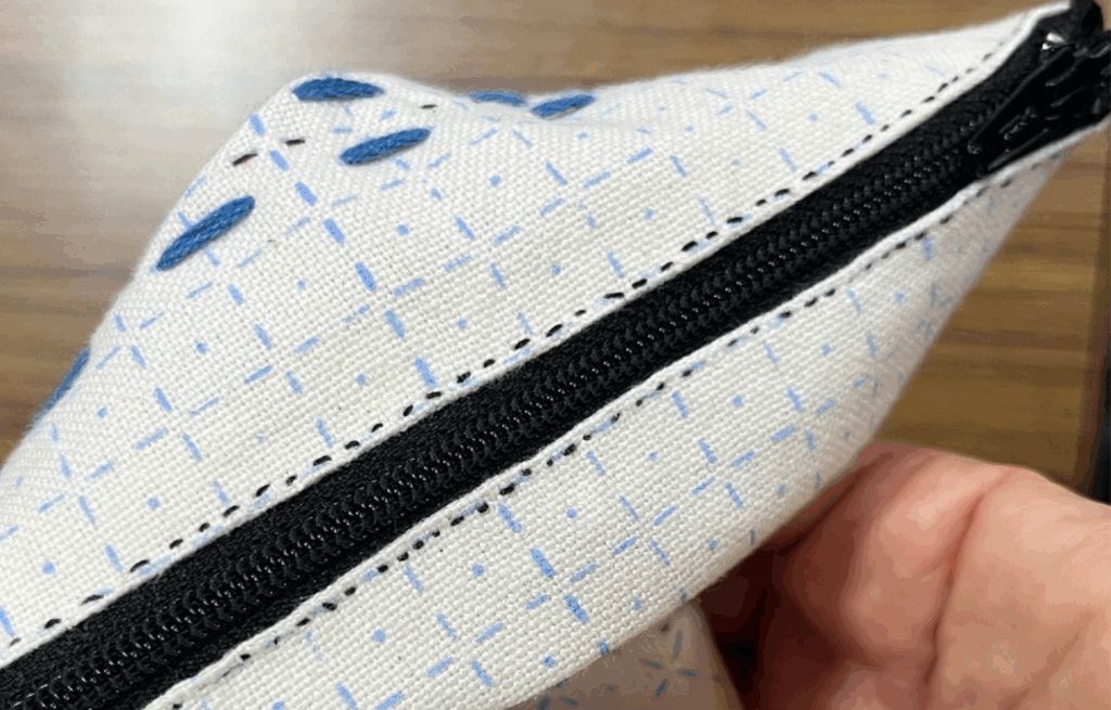 ▲ファスナーの縫い付けをしている途中で、「また刺し子をしたくなって戻った」という生徒もいました。