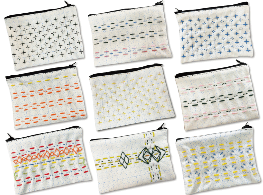「刺し子の防災おまもりポーチ」は、「方眼印刷済み」の専用布と、刺し子専門家による「つくり方動画」で、生徒がつまづきにくい教材にしました。難しすぎず、簡単すぎないので学年全体の授業としても扱いやすい教材です。オリジナル図案や糸の色を変えるだけで個性が出るのもポイント。