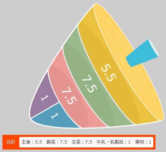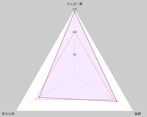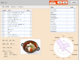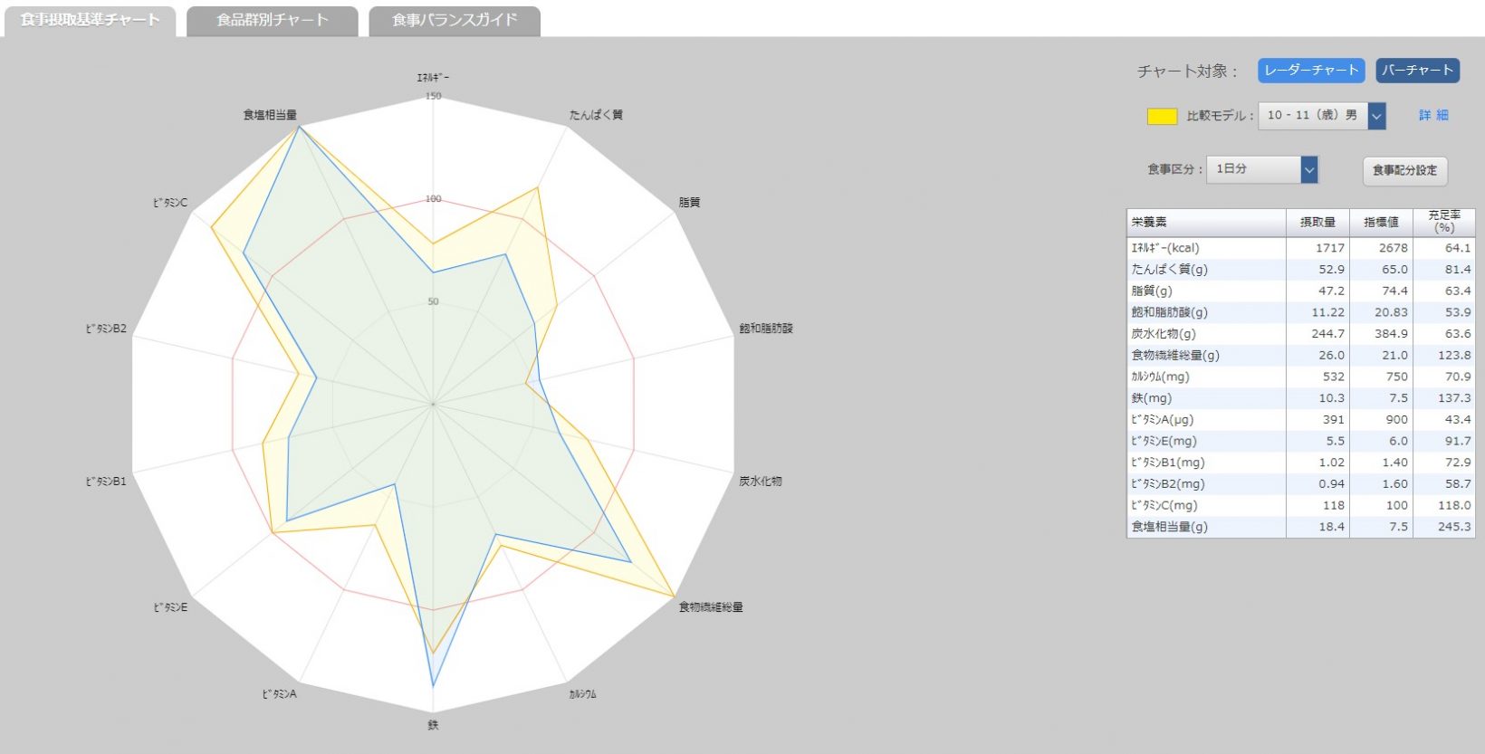 作成した献立の栄養価をレーダーチャート、バーチャートで表示。食事区分(1日、朝、昼、夕、間)ごとの表示も可能です。