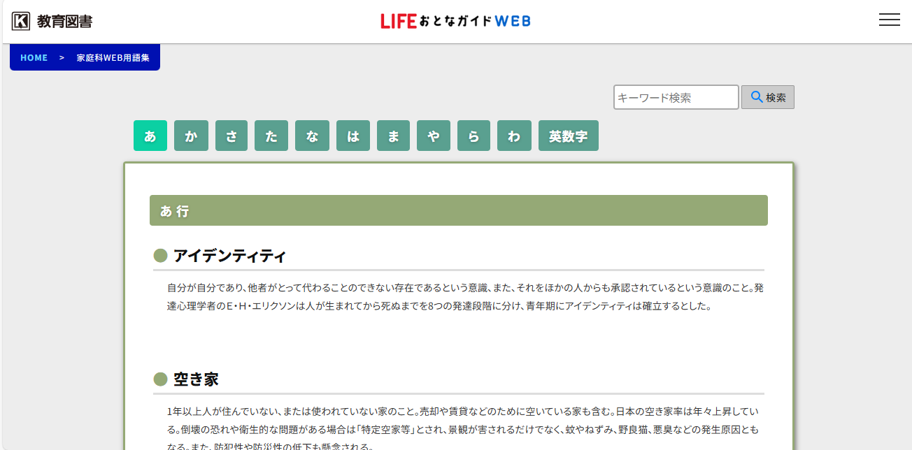 家庭科学習に必須の重要語句の解説がご覧いただけます。関連語句へのリンクや、小論文での出題例など家庭科の学びをより充実することができるコンテンツです。