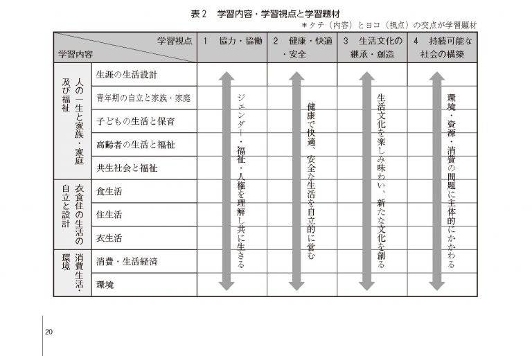例えば高校であれば、家庭基礎なら1年間、家庭総合なら2年間での題材ごとの学習が、本書(増補版p.23)に示したマトリックス表のどのあたりをカバーしているかを確認し、限られた授業時間の中で、大枠として、できるだけ全域をカバーできるよう、学習計画をたててみてはどうでしょうか。