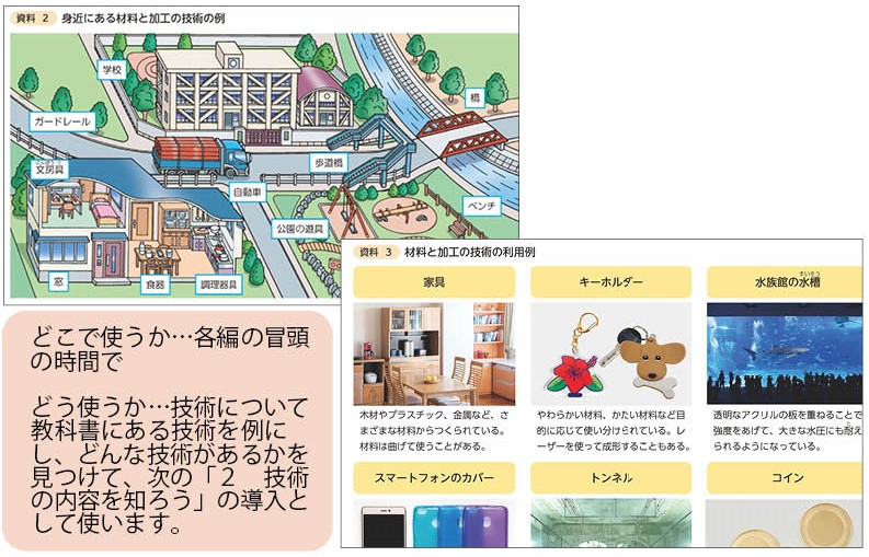 各編で学習する技術は、各編の「2 技術の内容を知ろう」で扱う技術を取り上げ、あまり範囲を広げないようにします。また、扱う技術は、生活の場に存在するので、身近な各編の技術を見つけてくることを宿題にしてレポートを提出させる方法も有効です。
