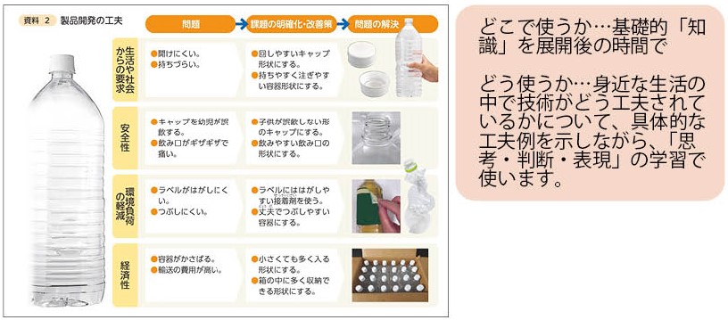 ○2章の問題解決のイメージを湧かせるため、資料にあるペットボトルを例にして、どんな問題の解決がされているか等で、技術による問題解決の工夫例をする学習指導がわかりやすいと思います。