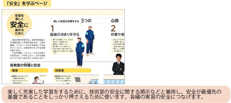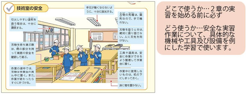 安全作業については、ガイダンスのページの「学習を楽しく安全に進めるために」及び各編2章冒頭の「実習などの安全な作業の進め方を知ろう」と連動させて、次のように使い分けた使い方をします。
