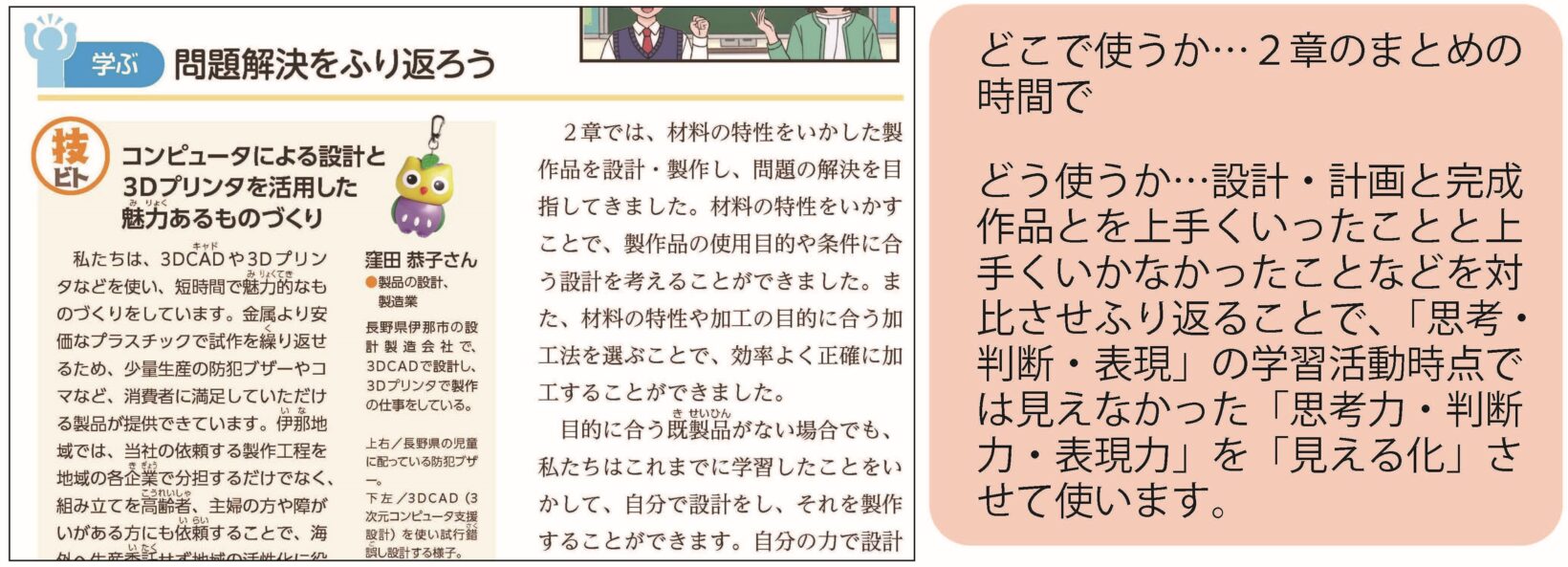 学習した成果を社会に広げて、技術分野の目標(3)の評価の観点に相当する「主体的に学習に取り組む態度」を学ぶページです。