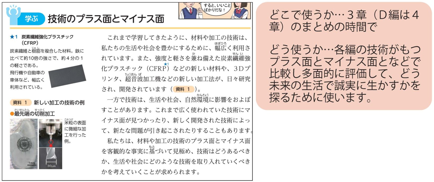 教科書各編の3章(D編は4章)は、学習指導要領の技術分野「2 内容」の「A~Cの技術」の(3)や「Dの技術」の(4)で示された内容に当たり、1章や2章で学んだ内容をふり返り、技術がもつプラス面やマイナス面を見極めて、これからの生活で技術を誠実にいかすにはどうしたら良いかを学ぶページです。