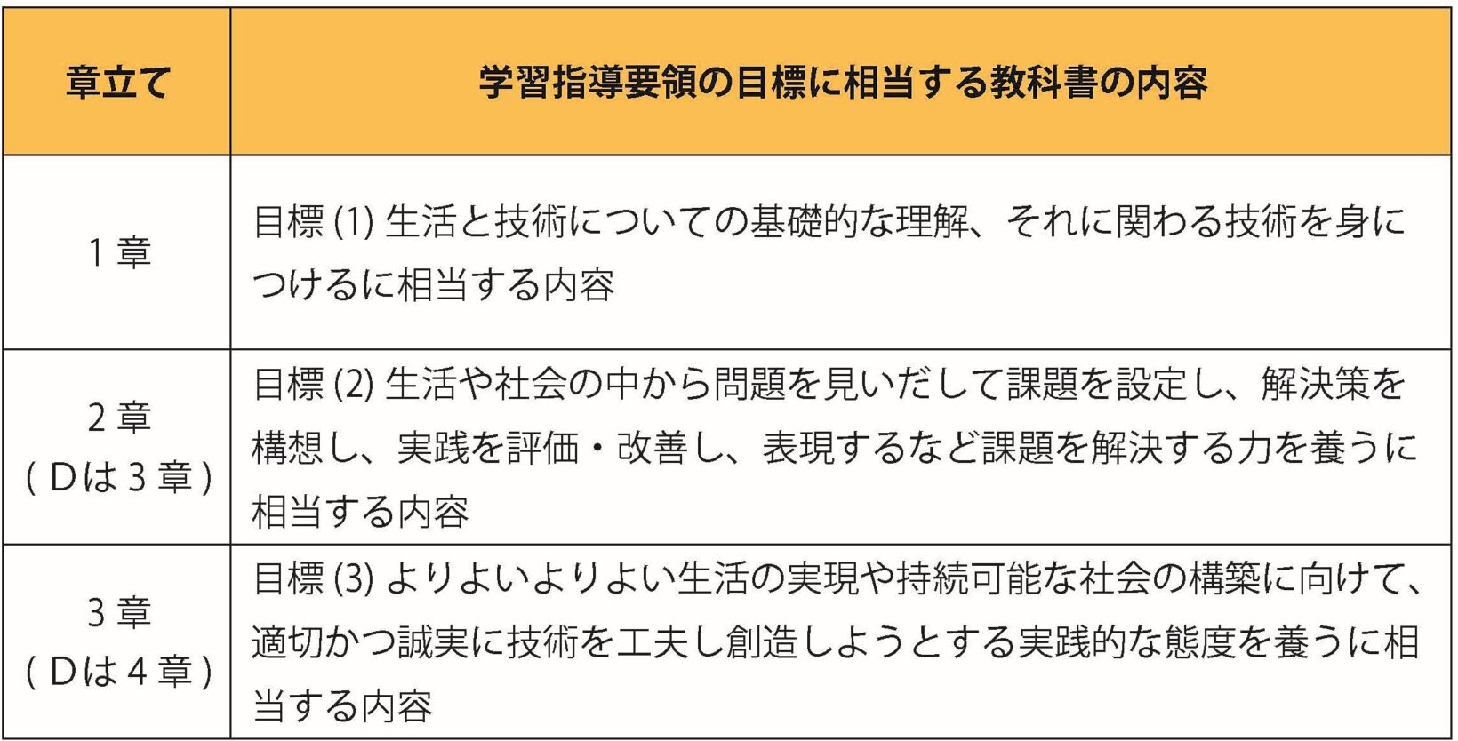 教科書各編の1章は、学習指導要領の技術分野「2 内容」の「A~Dの技術」の(1)で示された内容に当たり、2章以降の学習で活用していく、基礎知識を学ぶページです。