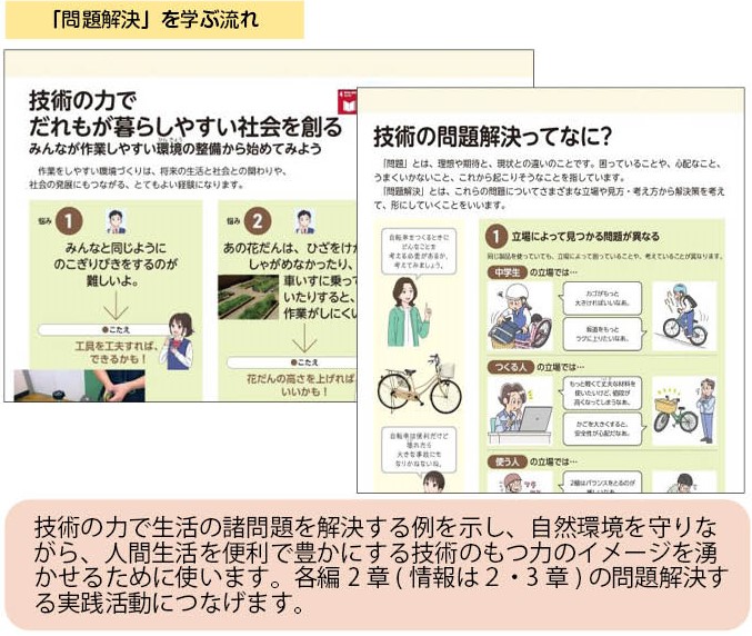 教科書各編の2章(D編は2・3章)は、学習指導要領の技術分野「2 内容」の「A~Dの技術」の(2)(D編は(3))で示された内容、及び、(1)で示された内容の「技能」に当たり、これらの内容を活用して、2章の技術による問題解決を学ぶページです。